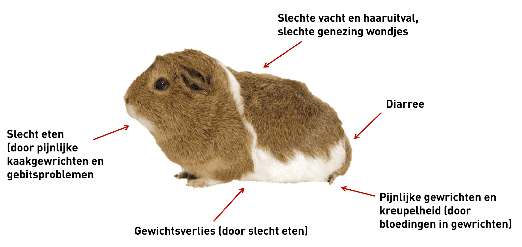 De meeste dieren kunnen zelf vitamine C maken uit voeding. Er zijn slechts sommige diersoorten die dit niet kunnen. Bijvoorbeeld mensen, apen en cavia’s. Omdat cavia’s zelf geen vitamine C kunnen aanmaken, is het heel belangrijk om ervoor te zorgen dat ze voldoende vitamine C binnen krijgen. Dit om een tekort te vermijden. Een tekort aan vitamine C kan namelijk voor verschillende klachten zorgen.