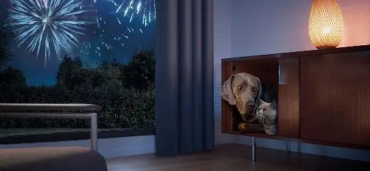 Tip 2 Vuurwerkangst kan voorkomen door zowel de knallen als de lichtflitsen van vuurwerk. Zorg dat ramen en deuren goed dicht zijn zodat er minder geluid binnenkomt. Het effect van de lichtflitsen kun je verminderen door gordijnen te sluiten en lampen aan te steken in de ruimte waar je huisdier verblijft. De radio of televisie kunnen voor extra afleiding zorgen. |