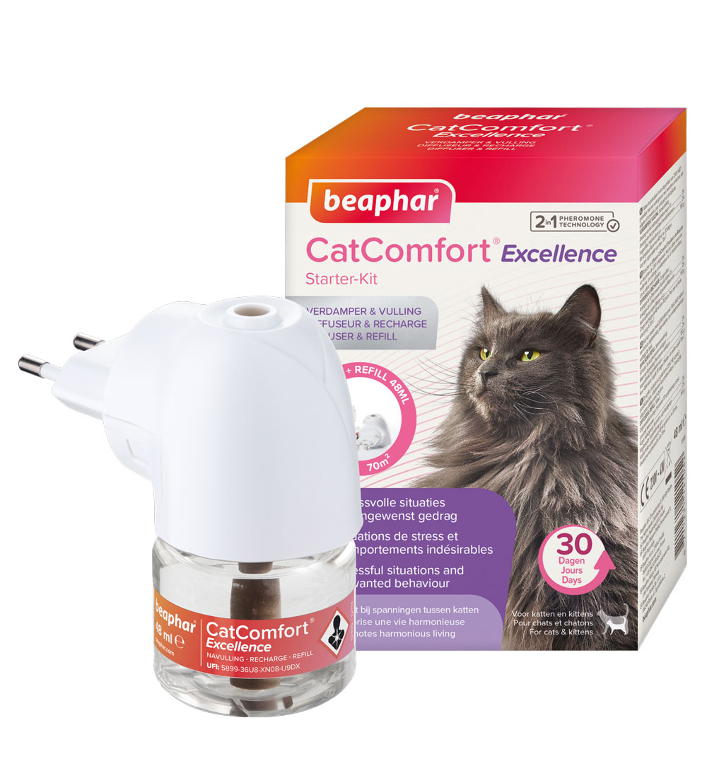 Beaphar CatComfort® Excellence reassures cats and kittens with a combination of two pheromones, substances that transmit certain signals. Ideal in situations where cats exhibit problem behavior due to stress or fear. Beaphar CatComfort® Excellence Diffuser Starter-Kit and Refill contain both the Maternal Appeasing Pheromone and the Feline Facial Pheromone.